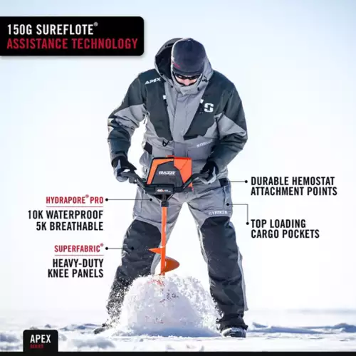Stay extra warm on the ice this season with the Men’s Striker Apex Bib. These Striker Apex Bibs offer a 320D nylon tussor shell with 80 grams of Primaloft® gold insulation to keep you warm on cold winter days. The C6 durable water repellent finish helps to wick moisture and the 150 grams of Sureflote® flotation assistance technology will keep you safe in case of accidents on the ice. With YKK zippers, an adjustable inseam, and a magnetic stormflap closure, the Striker Apex Bibs offer a lightweight breathable yet protective ice bib that will last you season over season. Plus, the SuperFabricâ„¢ reinforced heavy-duty knee panels offer comfortable maneuverability bending down to check your bait and line. Never worry about warmth again on the ice with the Men’s Striker Apex Bib.