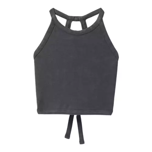 Hemp/organic cotton blend jersey • 290gsm • High neck tie back crop top • Self binding at neck, armholes and bottom hem • Covered elastic back straps • Interior shelf bra with plush elastic • Standard Fit