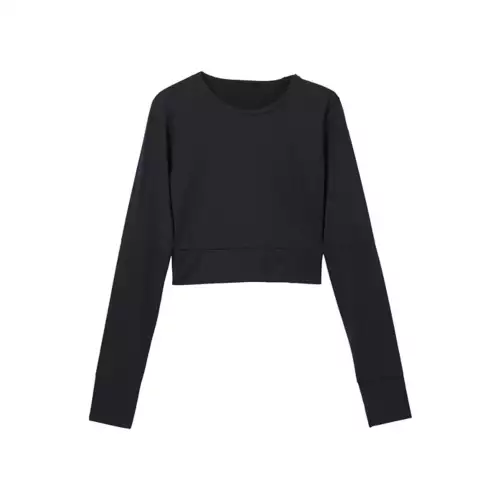 Performance chlorine resistant, quick drying stretch fabrication. UPF 50+ Rated • Long sleeve, cropped rash guard • Crew neck with soft neck band • Raglan sleeve with underarm gusset and seaming details • Thumbhole at sleeve hem • Cropped Length, Fitted